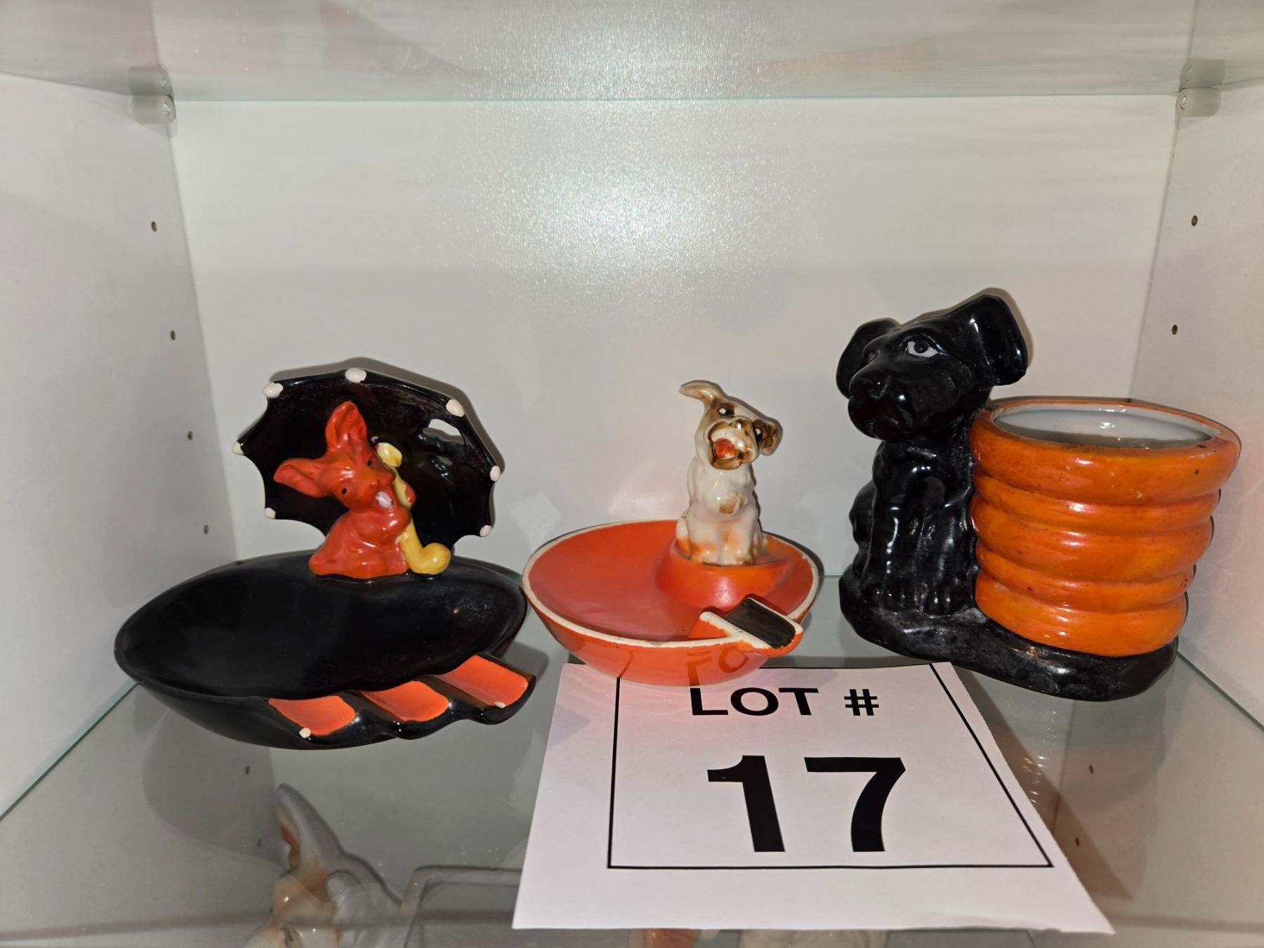 Three-piece lot of Japanese ceramic novelty dog items including figural ashtrays and a dog-form planter. Hand-painted glazed ceramic with umbrella and seated dog motifs.