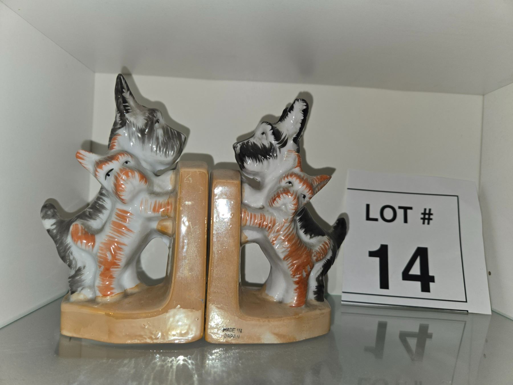 Matched pair of ceramic Scottie dog bookends marked MADE IN JAPAN. Hand-painted with gray, white, and orange detailing. Solid ceramic bases. Minor wear and glaze imperfections, typical of vintage export ceramics. Attractive mid-century décor. Sold as one pair.
