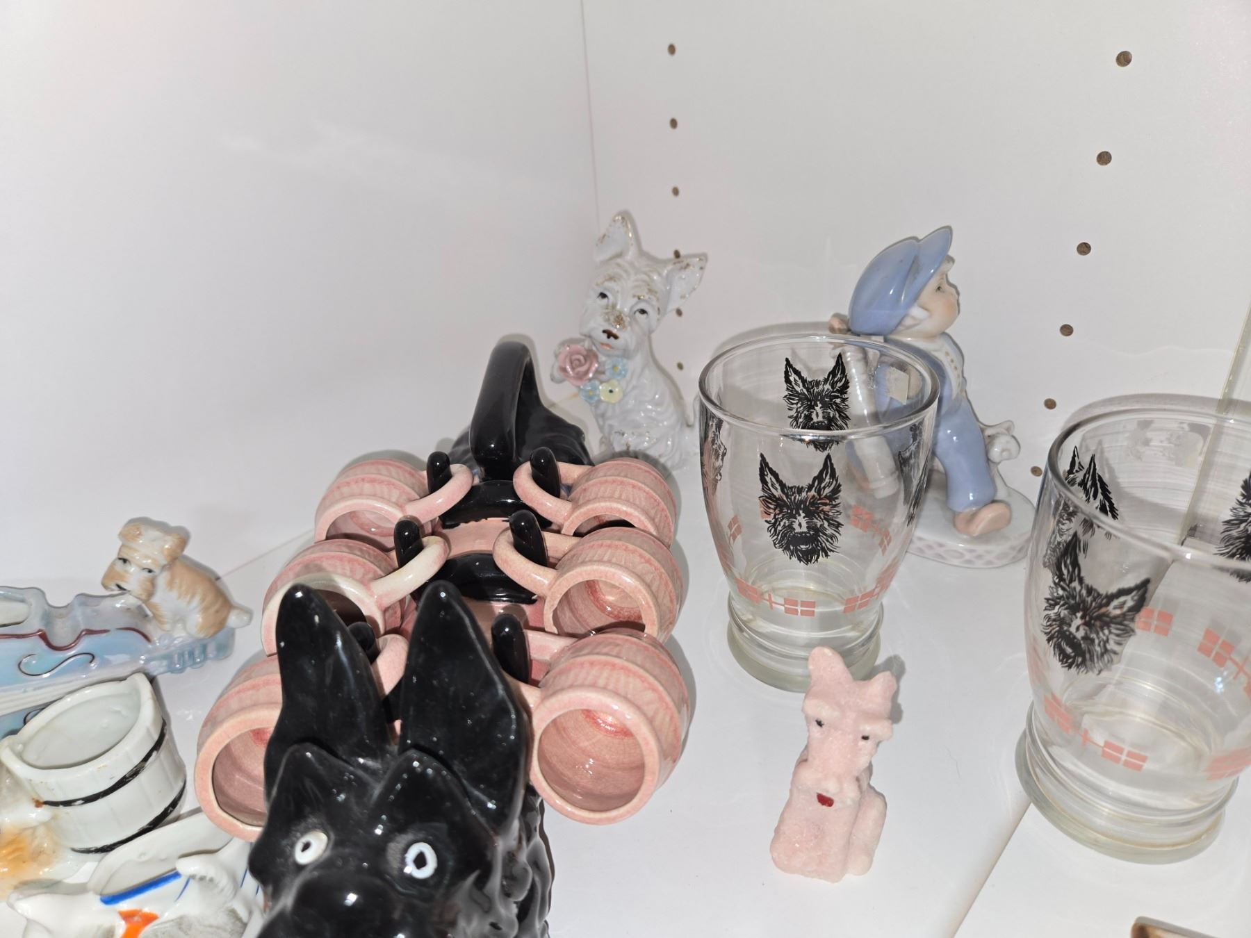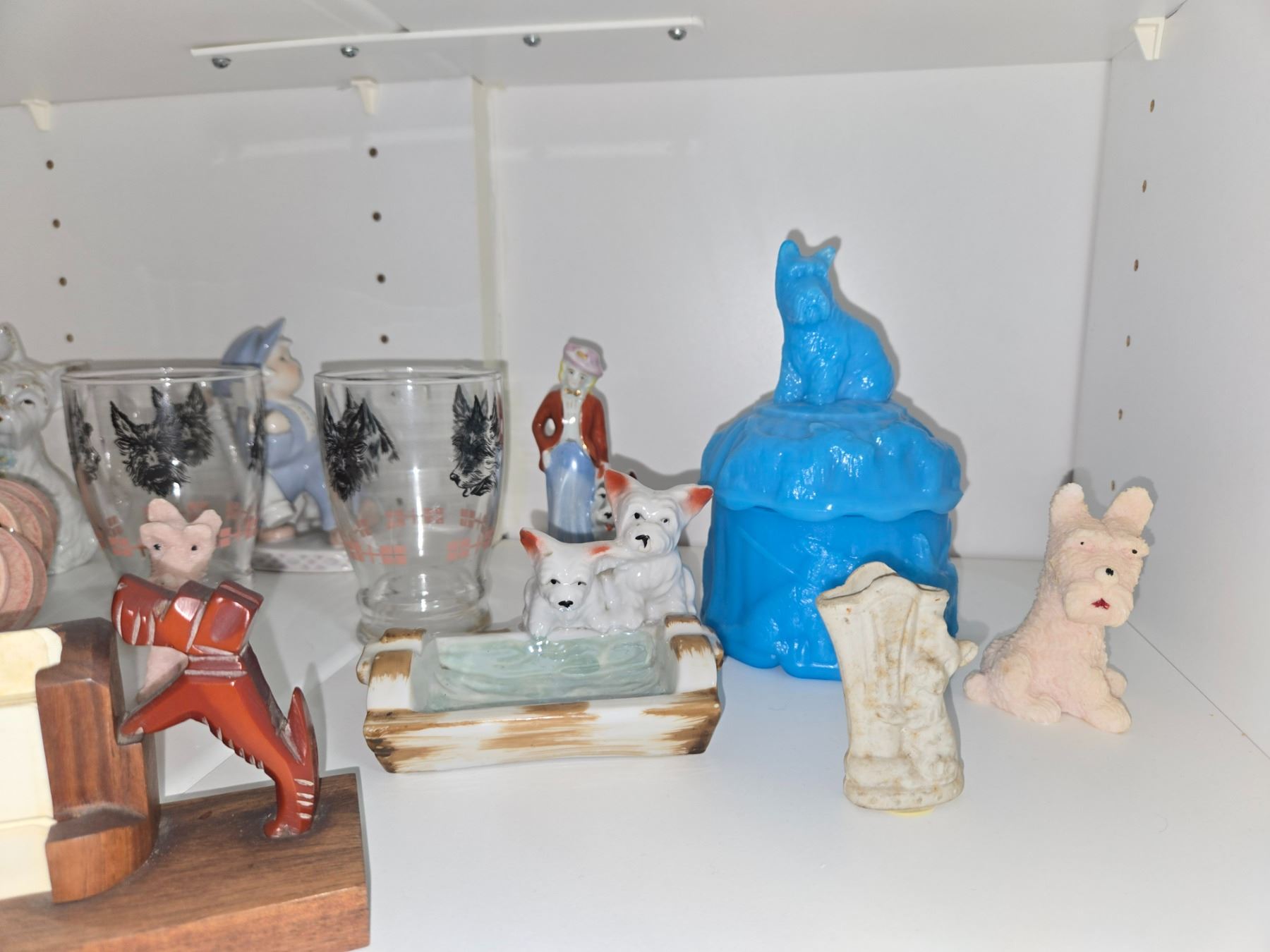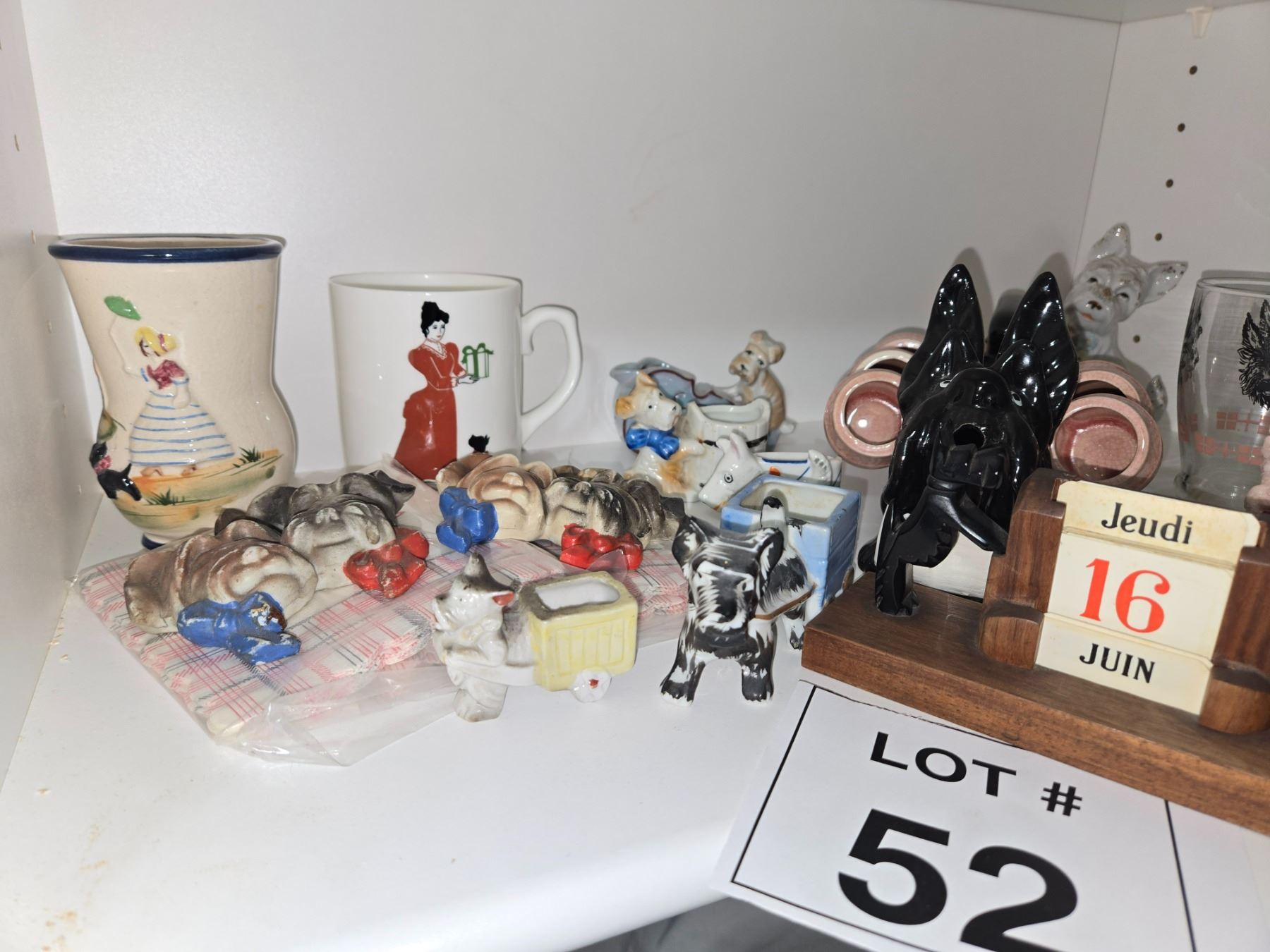Mixed lot of small Scottie dog desk and decorative items including ceramic miniatures, novelty containers, glassware, and a perpetual desk calendar with dog motif.