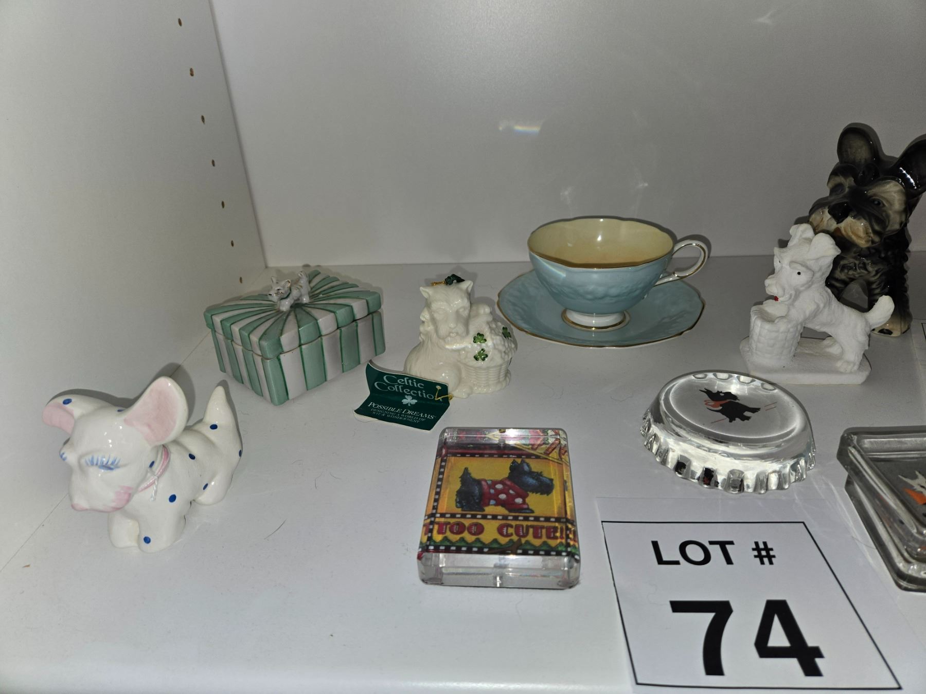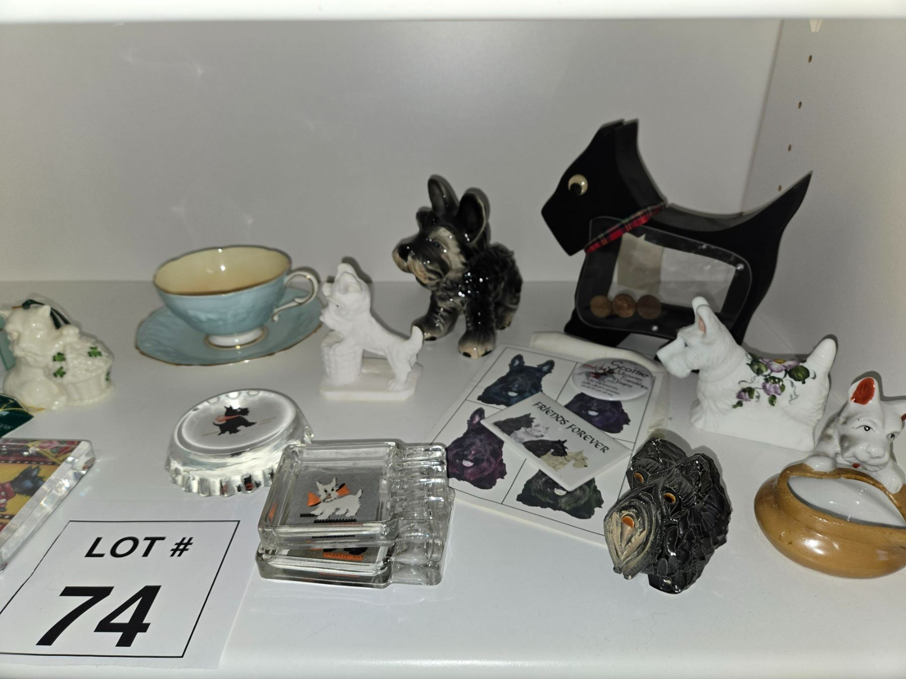 Collection of vintage Scottish Terrier ceramic figurines and desk accessories, including bells, miniature figures, and decorative pieces.