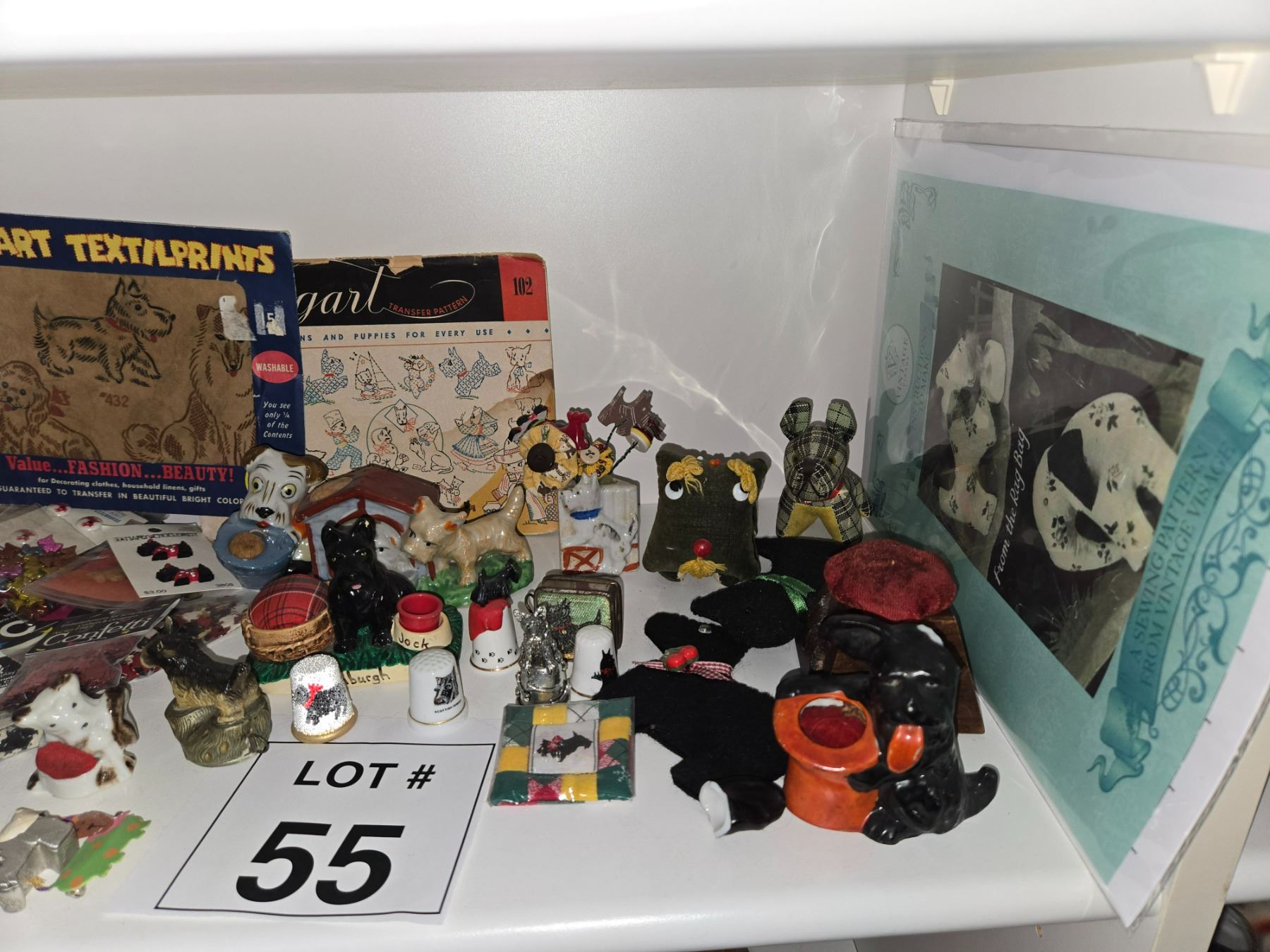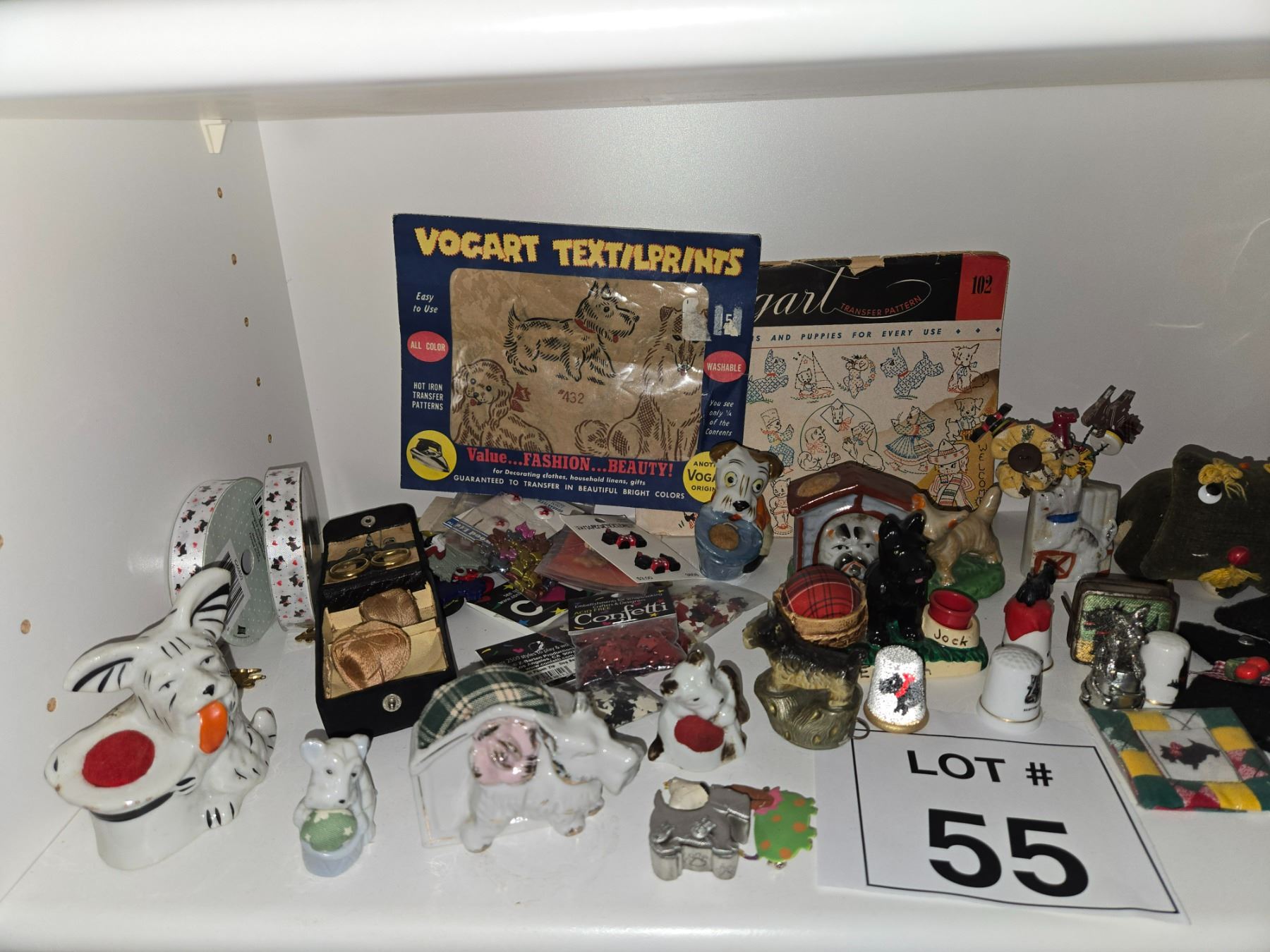 Large mixed lot featuring Scottish Terrier themed figurines, thimbles, salt & pepper style miniatures, novelty décor, and vintage textile transfer patterns including “Vogart Textilprints.” Includes ceramic dogs, felt and fabric items, small tins, and paper ephemera.